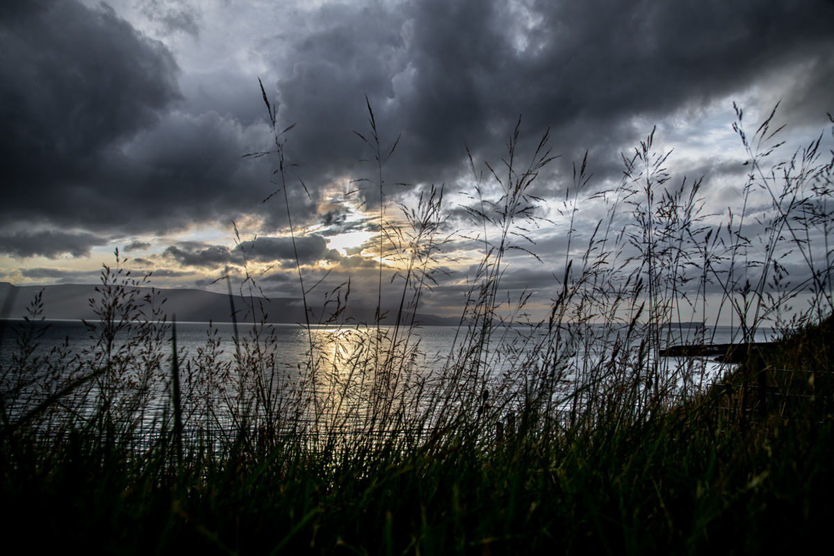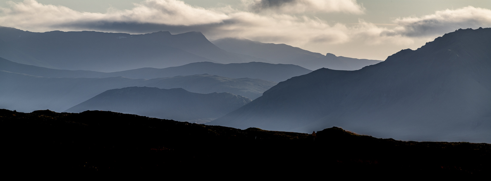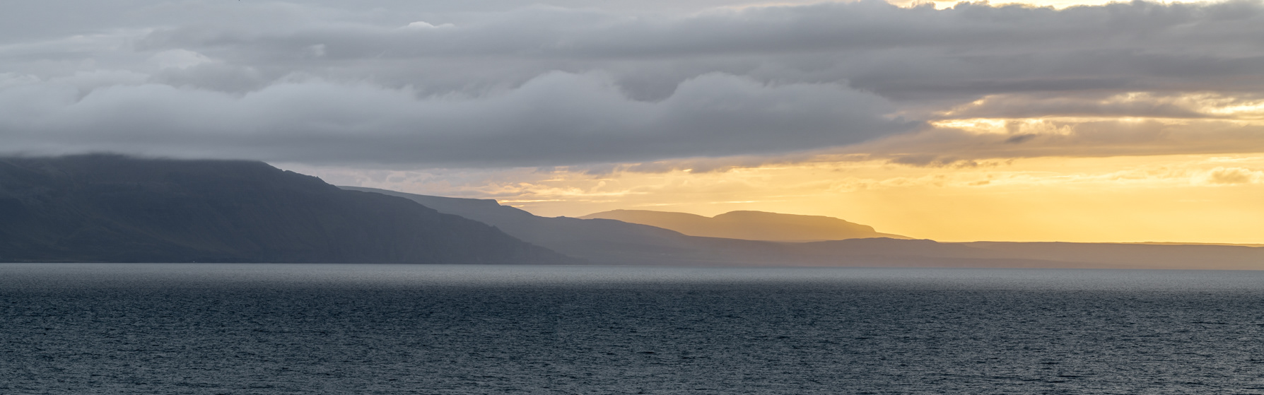 Looking over Húnafjörður at the distant mountains covered by dramatic cloud cover