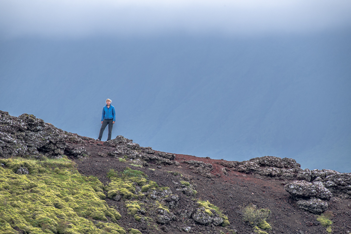 Sue in the Nátthagi lava field - Route C - Fagradalsfjall volcano, Reykjanes peninsula, Iceland (NOTE: Sue is standing on area of ground that was not covered by lava)
