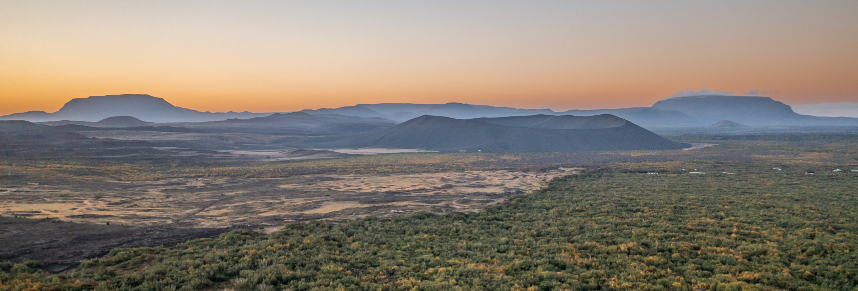 Sunrise over Mývatn with Búrfell (left), the Hverfjall crater (center), and Heilagsdalsfjall (right) off in the distance.