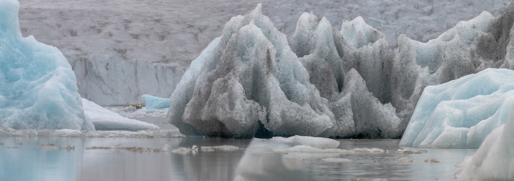 Note the people in the yellow life jackets in the boat seen in the left side of this image taken at the Fjallsárlón Glacial Lagoon. That gives you a sense of how big these blocks of ice really are.