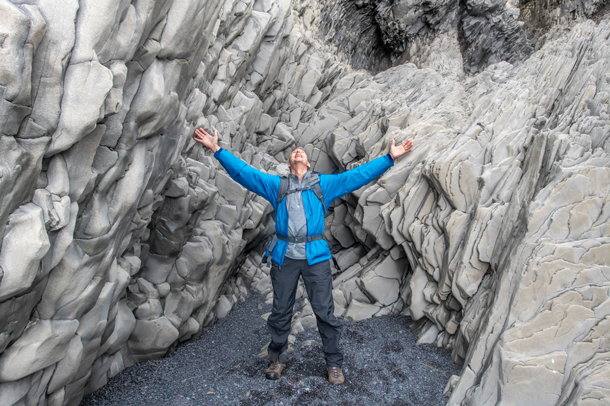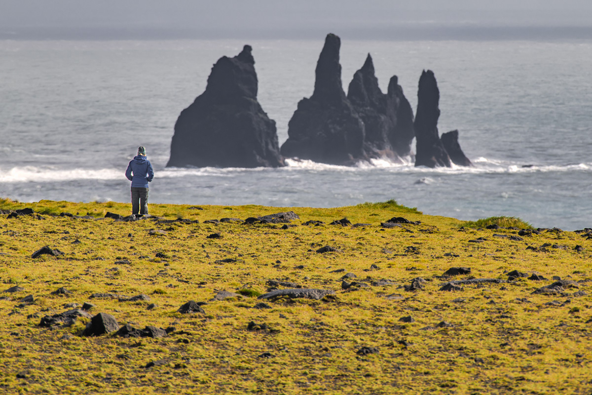 Sue is dwarfed by the black lava columns of the Reynisdrangar come out of the sea as viewed from the top of the Dyrhólaey peninsula.