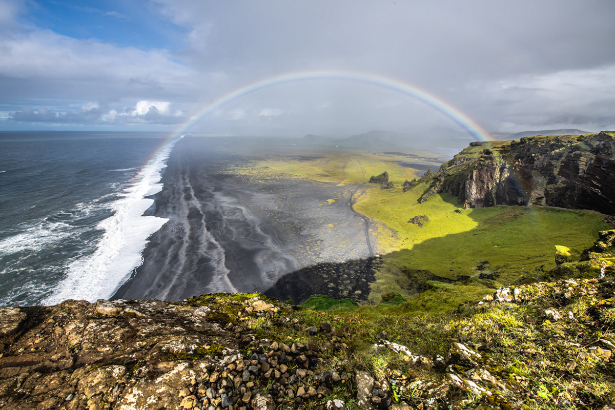 Thor, our motorhome away from home, under the rainbow as seen from the lower Dyrhólaey peninsula.