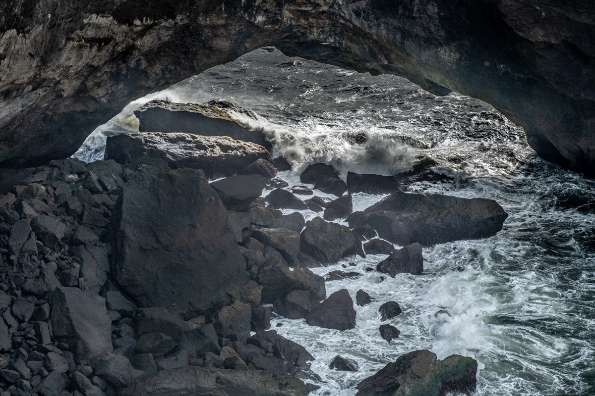 Black lava arch at the ocean's edge in front of the Dyrhólaey peninsula.