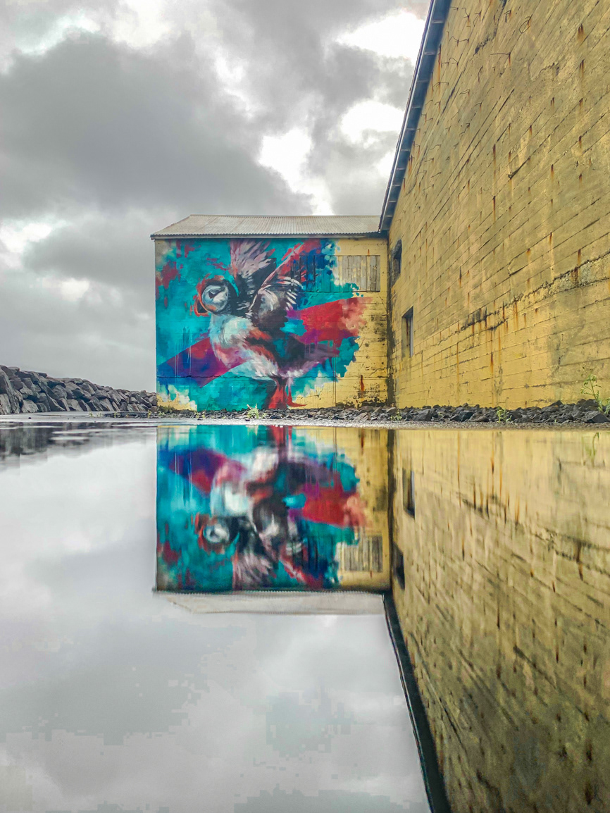 The image is a portrait of ‘Sia’ who had passed away in 2010 in Akureyri. This piece was painted by Guido Van Helten in 2014 and is based on archival imagery of a play performed by the young actress.