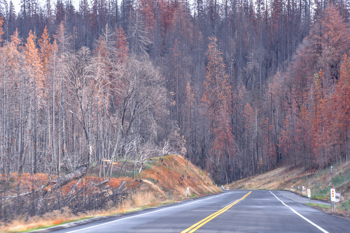 Logging conducted along the Tioga Pass (Highway 120) after the Rim fire salvaged approximately 210 million board feet of lumber and left most of the burned area untouched.