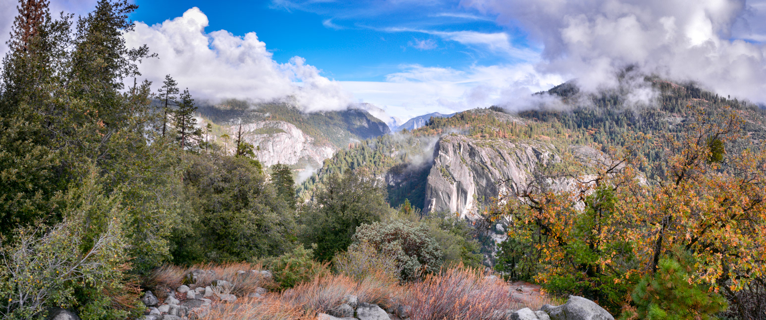 Looking east towards Half Dome, Mount Broderick, Liberty Cap and Nevada Falls in Little Yosemite Valley from the John Muir Trail.
