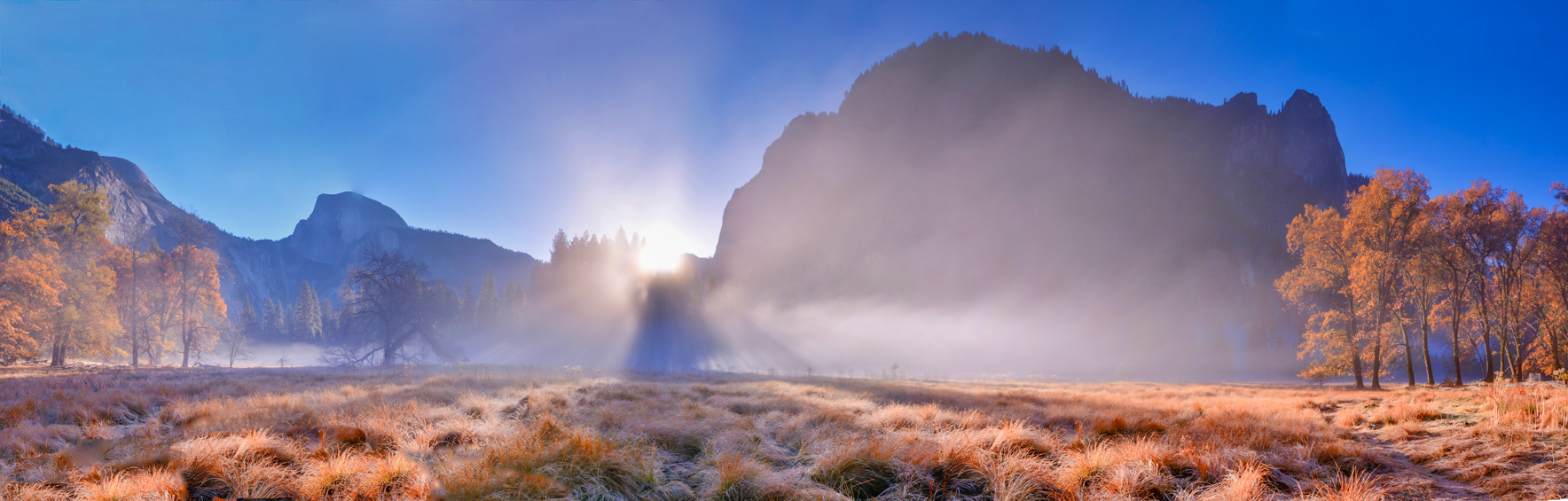 Sunrise over Half Dome just east of Yosemite Valley Lodge from a meadow off of Northside Drive (37.745767, -119.592297).