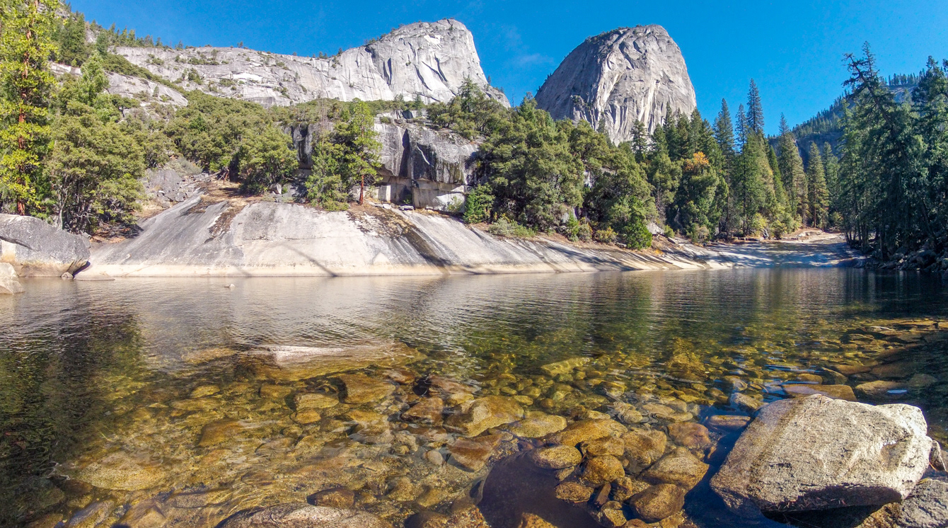 Mount Broderick (left) and Liberty Cap (right) from a pool just above Vernal Falls on the Mist Trail running along the Merced River.