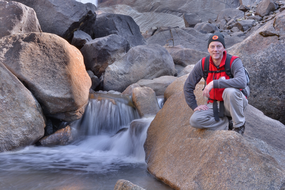 At the base of Nevada Falls on the Mist Trail.